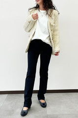 細身に仕上げたストレートシルエットです。両面起毛でありながらしっかりキックバックを感じる生地に仕上げたことで、脚を細く長く見せてくれます。