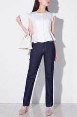 ウエストからヒップにかけて程よく身体にフィットして、窮屈感なく快適に着用できる美脚ストレートシルエットです。生地の上品な光沢感に、後ろポケットの優美なカーブがカジュアル過ぎない大人の女性にマッチします。