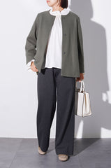 ニットならではの軽やかな着心地と、裏起毛のぬくもり。目の詰まった編み立てでラインを拾いにくく、安心感のあるはき心地です。