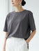 二の腕がカバーできる袖丈に、デコルテを見せすぎない衿ぐり。パターンと縫製にこだわって、美しい佇まいを作るTシャツです。