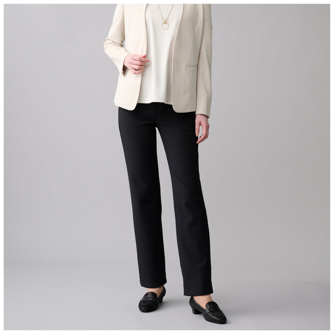 ハイストレッチが膝抜け・着用ジワを軽減。1日はいてもきれいを保ちます。
