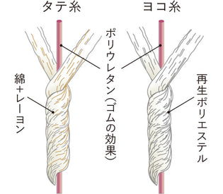 ゴムの性質をもつ糸に綿混の糸を巻きつけることで、パンツにしっかりとした伸縮性を