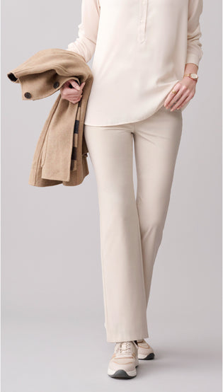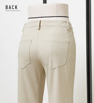 前身頃と後身頃の間に1パーツ入れ込む特別なパターンを採用。股下を長く見せ、すらりと長く伸びた脚に導きます。