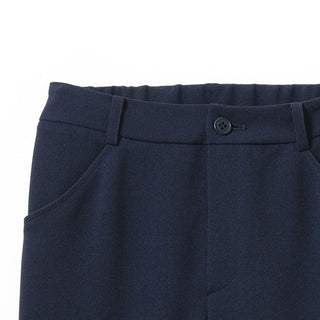 優雅に落ちるドレープ感のある生地の特性を活かして、太すぎないワイドシルエットを採用しました。後ろウエストゴムで着心地らくちん、見た目はすっきり。気になる太ももまわりをカバーしながら、膝位置を高めに設定した美脚パターンで脚長見せも叶います。